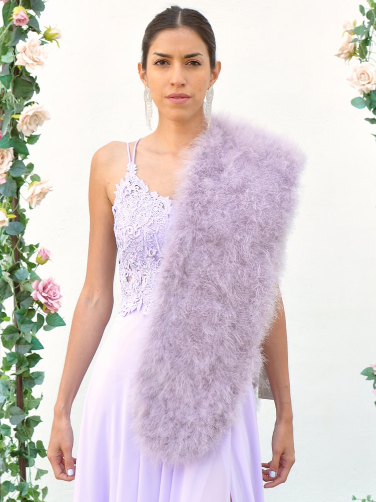 - Estolas de pluma que se pueden colocar sobre un único hombro o cruzar en la cintura, quedando enganchada gracias a que se introduce un extremo en un agujero de la otra parte. Están disponibles en varios colores y confeccionadas con plumas de gran calidad.