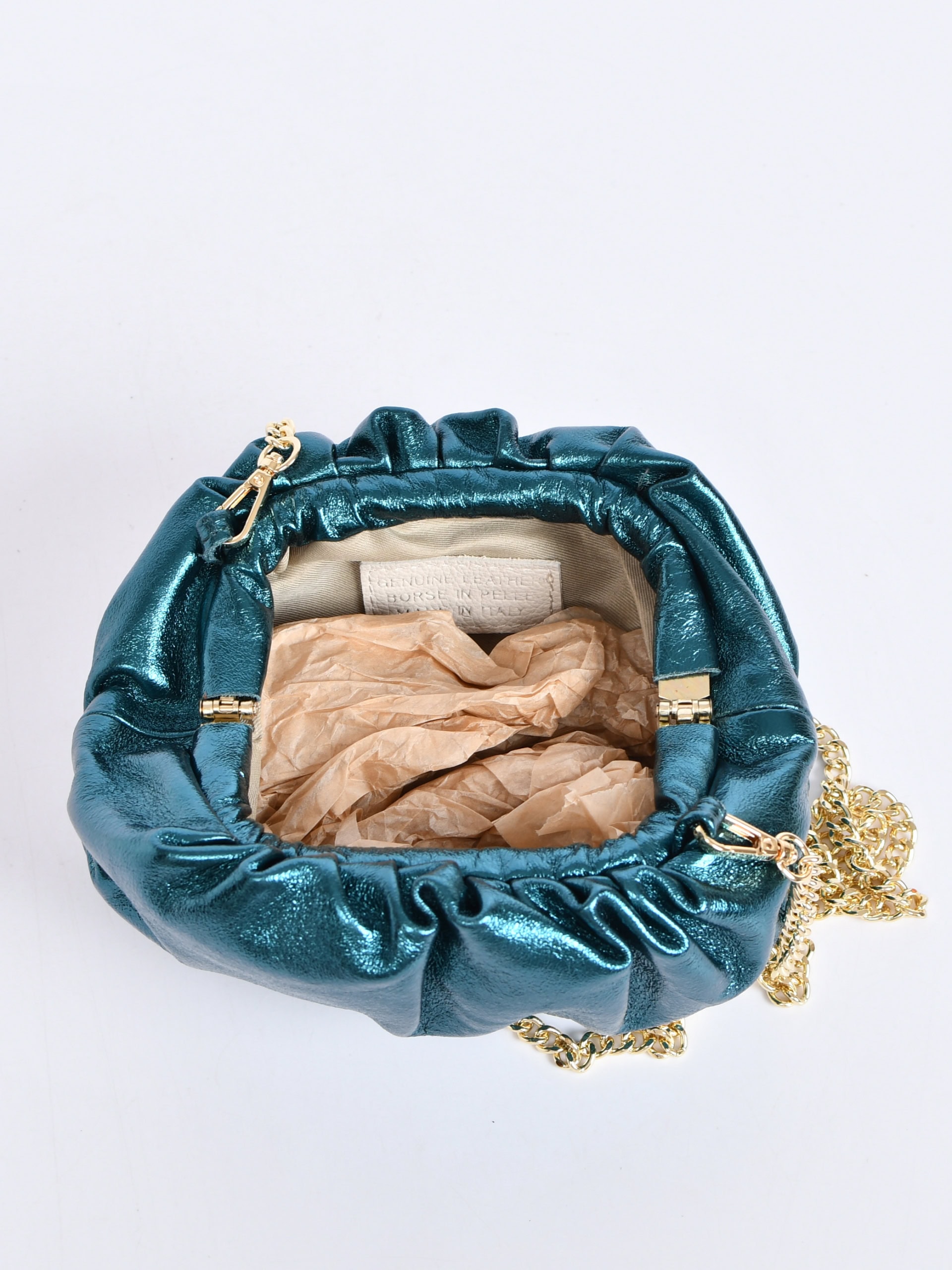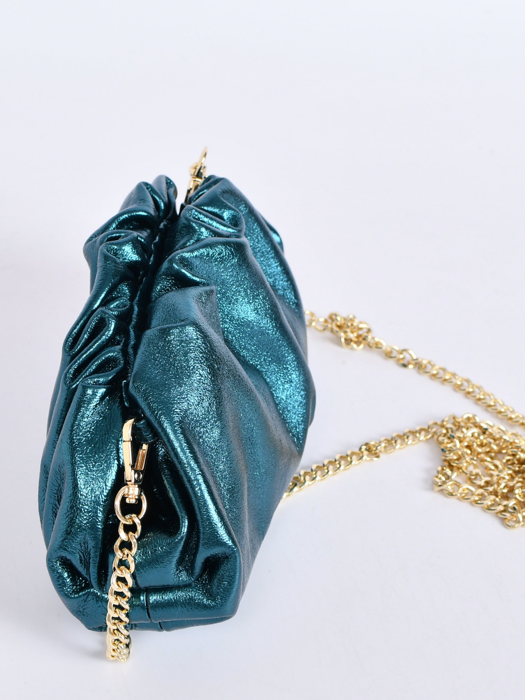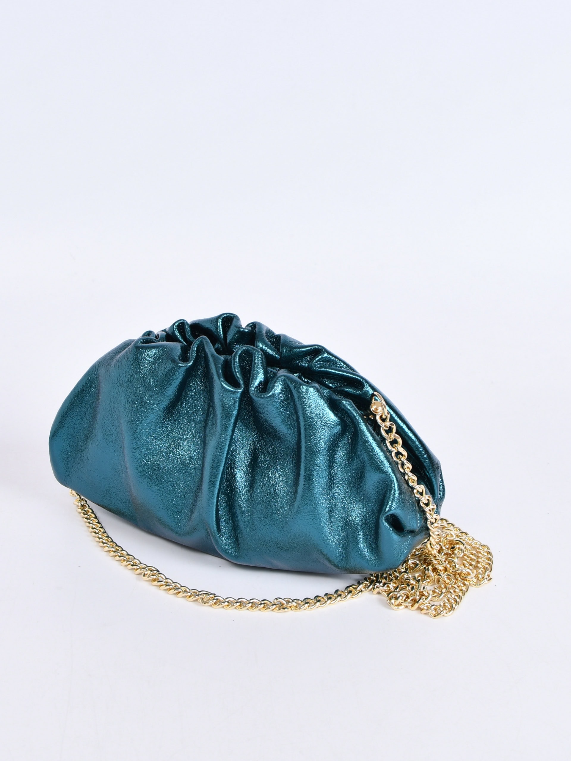 Gracias a su versatilidad, este clutch de mano de piel metalizada arrugada es perfecto para complementar una gran variedad de outfits, desde un look casual hasta un atuendo más formal. Su cadena dorada desmontable te permite llevarlo cómodamente al hombro o en la mano, dependiendo de la ocasión. Además, su tamaño compacto es ideal para llevar tus esenciales sin perder la elegancia.