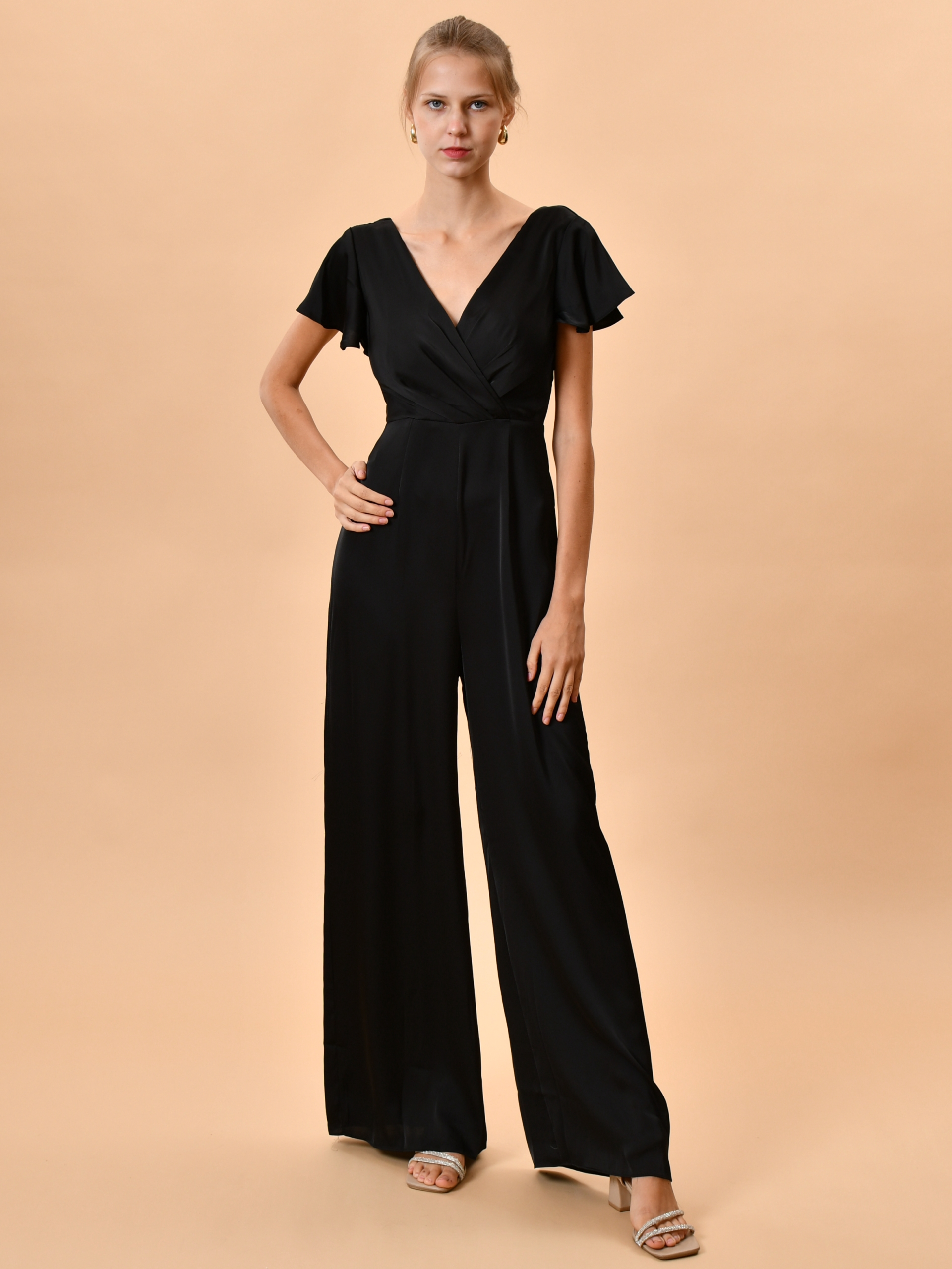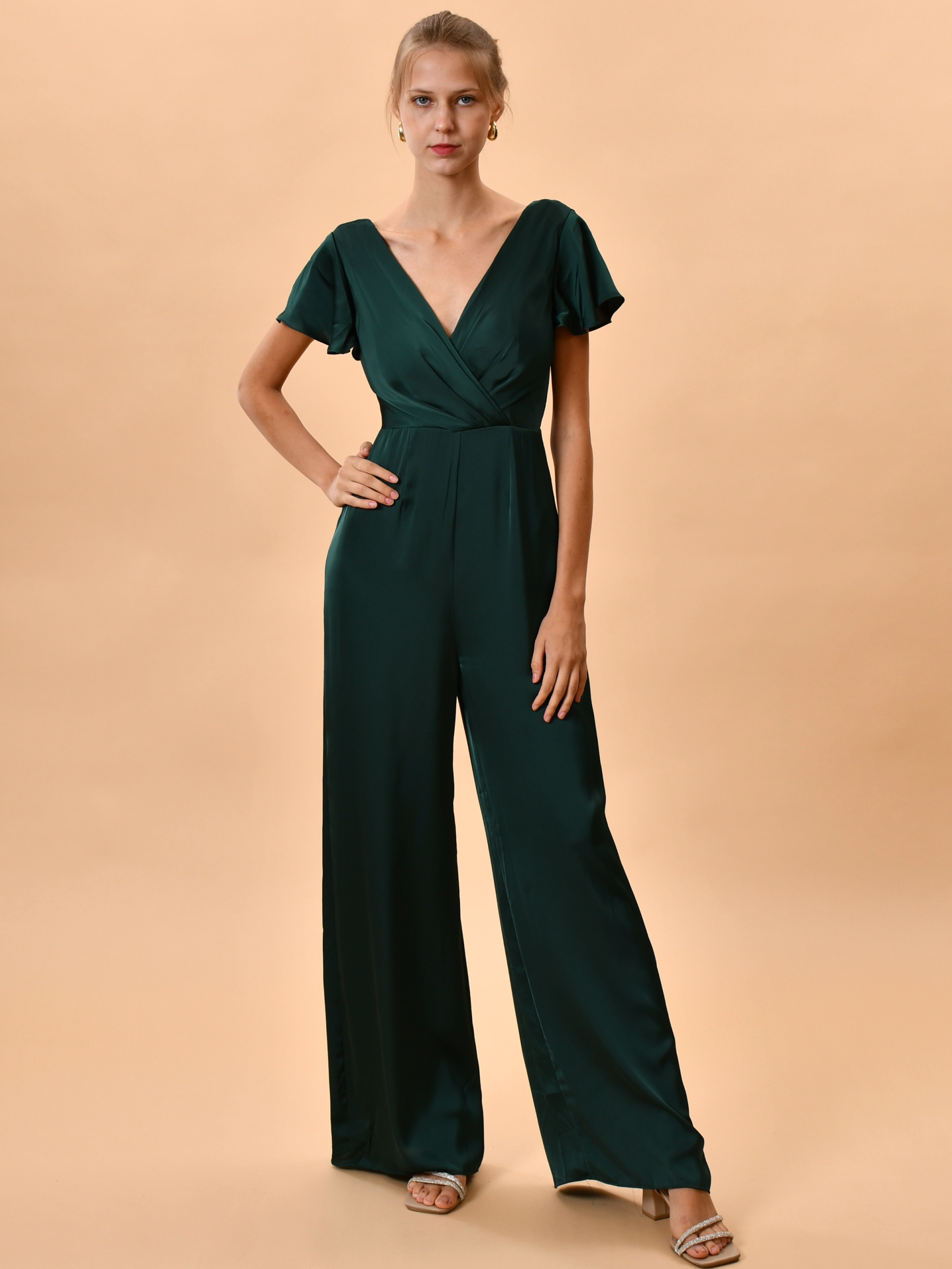 Su escote cruzado en forma de “V” realza el cuello y alarga visualmente la figura, mientras que las mangas cortas con caída fluida aportan feminidad y equilibrio. El corte en la cintura define la silueta, y el pantalón de pierna ancha estiliza la postura, logrando una imagen de porte refinado. El mono de vestir satinado es una alternativa ideal a los vestidos de cóctel o de noche, ofreciendo una presencia igual de elegante, pero con un aire contemporáneo y seguro.