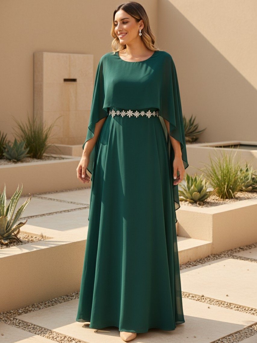 Ideal para eventos de noche, el vestido de fiesta largo con mangas volantes es perfecto para quienes buscan un look de impacto sin sacrificar la comodidad. La parte superior tiene un corte sencillo y elegante, que se complementa con una cintura definida por un cinturón decorativo. Este detalle acentúa la silueta de forma estilizada y le da al vestido un toque de brillo y sofisticación. La falda larga y fluida proporciona un movimiento encantador al caminar, logrando un equilibrio entre lo clásico y lo moderno.