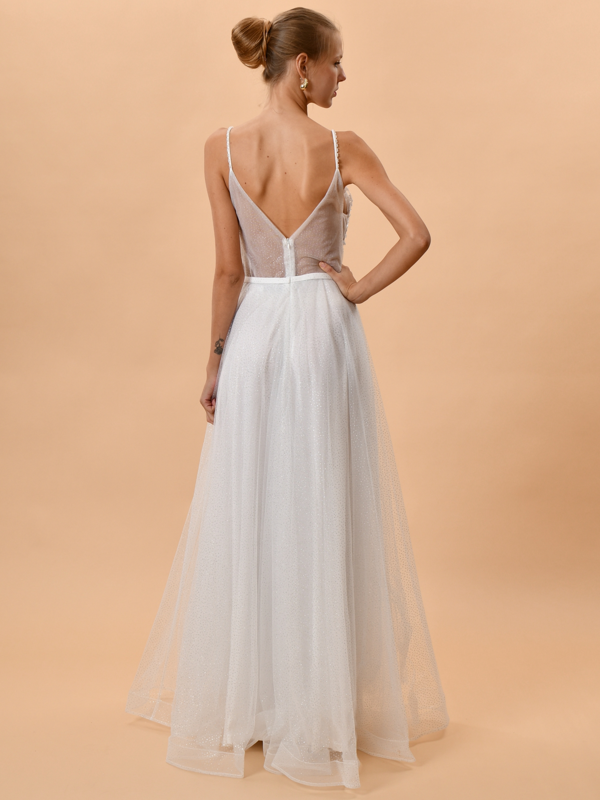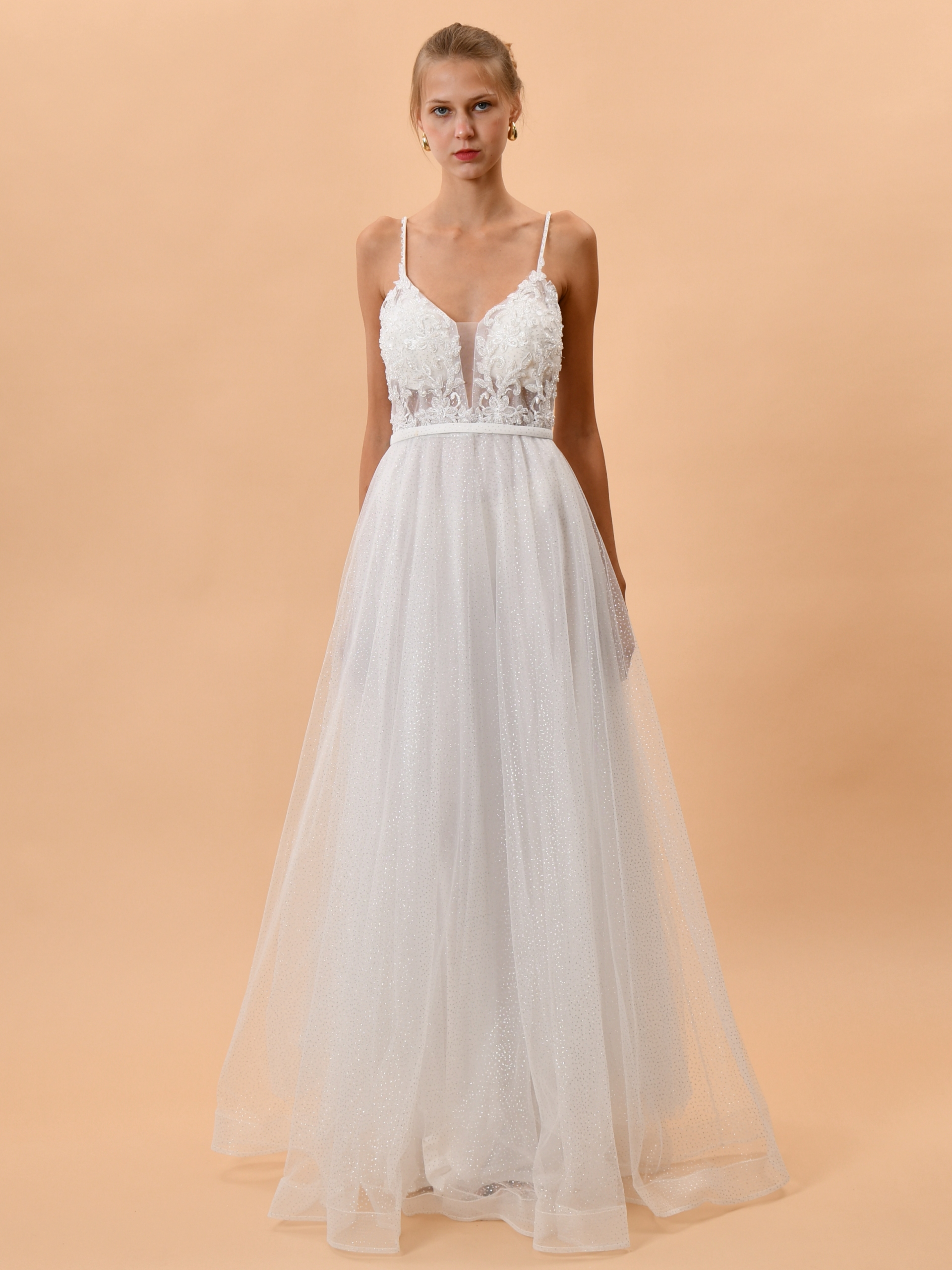 El cuerpo del vestido destaca por su minucioso trabajo artesanal, con bordados en relieve y pedrerías cuidadosamente distribuidas para capturar la luz de manera sutil y elegante. Cada detalle ha sido diseñado para crear un equilibrio perfecto entre brillo y delicadeza. La falda de tul, amplia y vaporosa, envuelve la figura con gracia, otorgando una caída ligera que añade movimiento y un aire de ensueño.