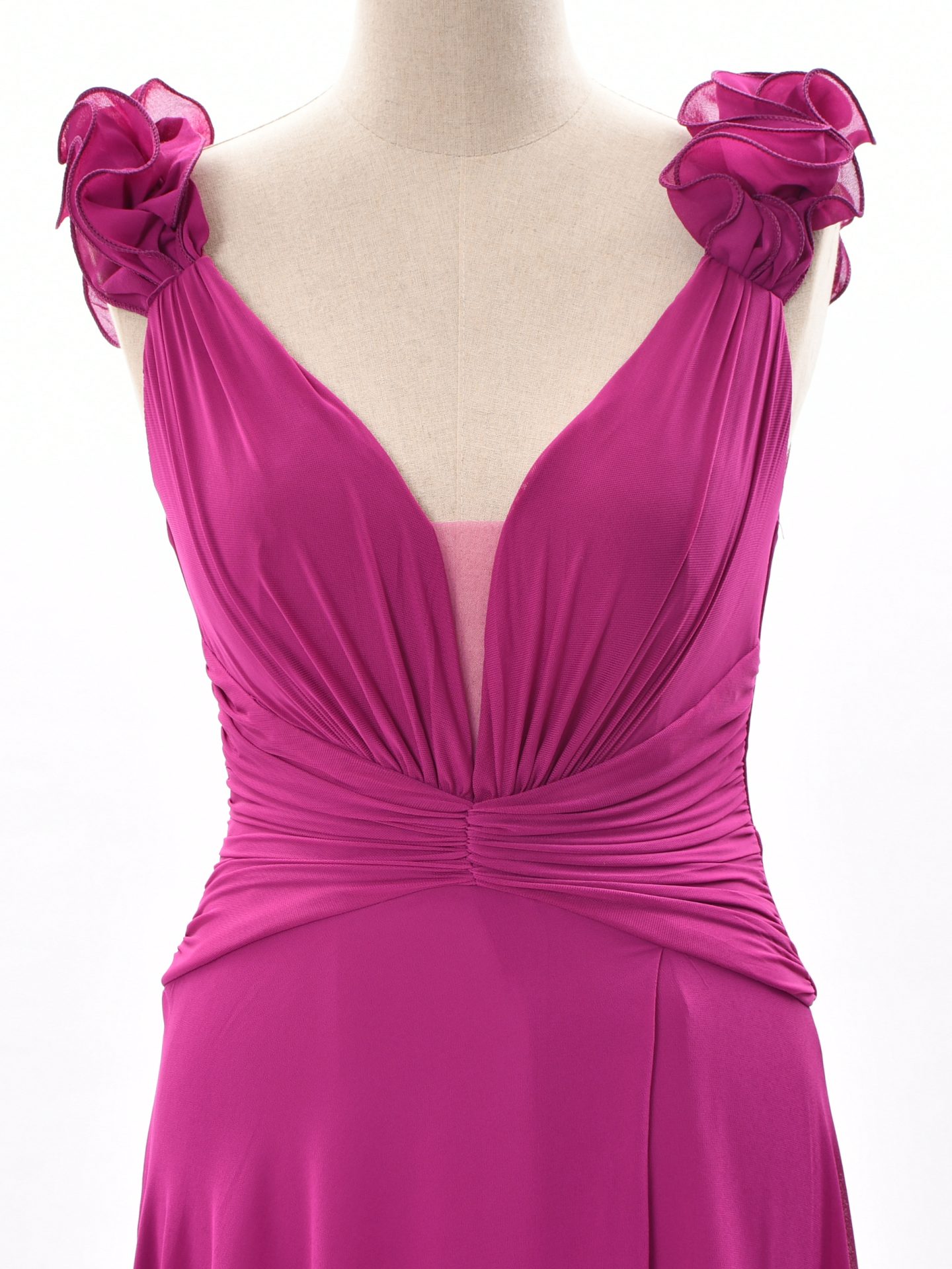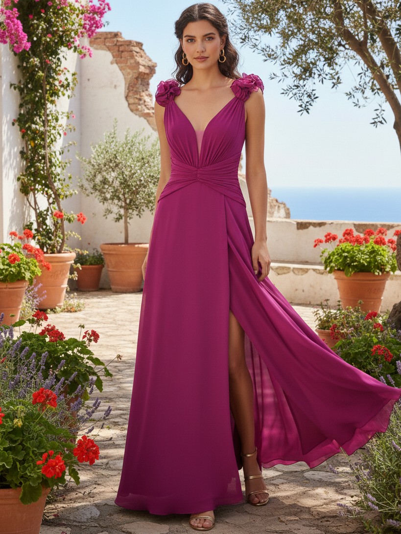 Este diseño destaca primordialmente por su capacidad para esculpir la silueta femenina con una delicadeza asombrosa. El cuerpo del vestido presenta un meticuloso trabajo de drapeado que converge en la cintura, creando un efecto visual de continuidad y elegancia. El escote en pico, equilibrado y sugerente, se complementa a la perfección con el detalle ornamental de los hombros. Estos apliques en forma de volantes aportan una dosis de romanticismo y volumen estructural, elevando el Vestido fiesta largo Anastasia a la categoría de pieza de alta costura.