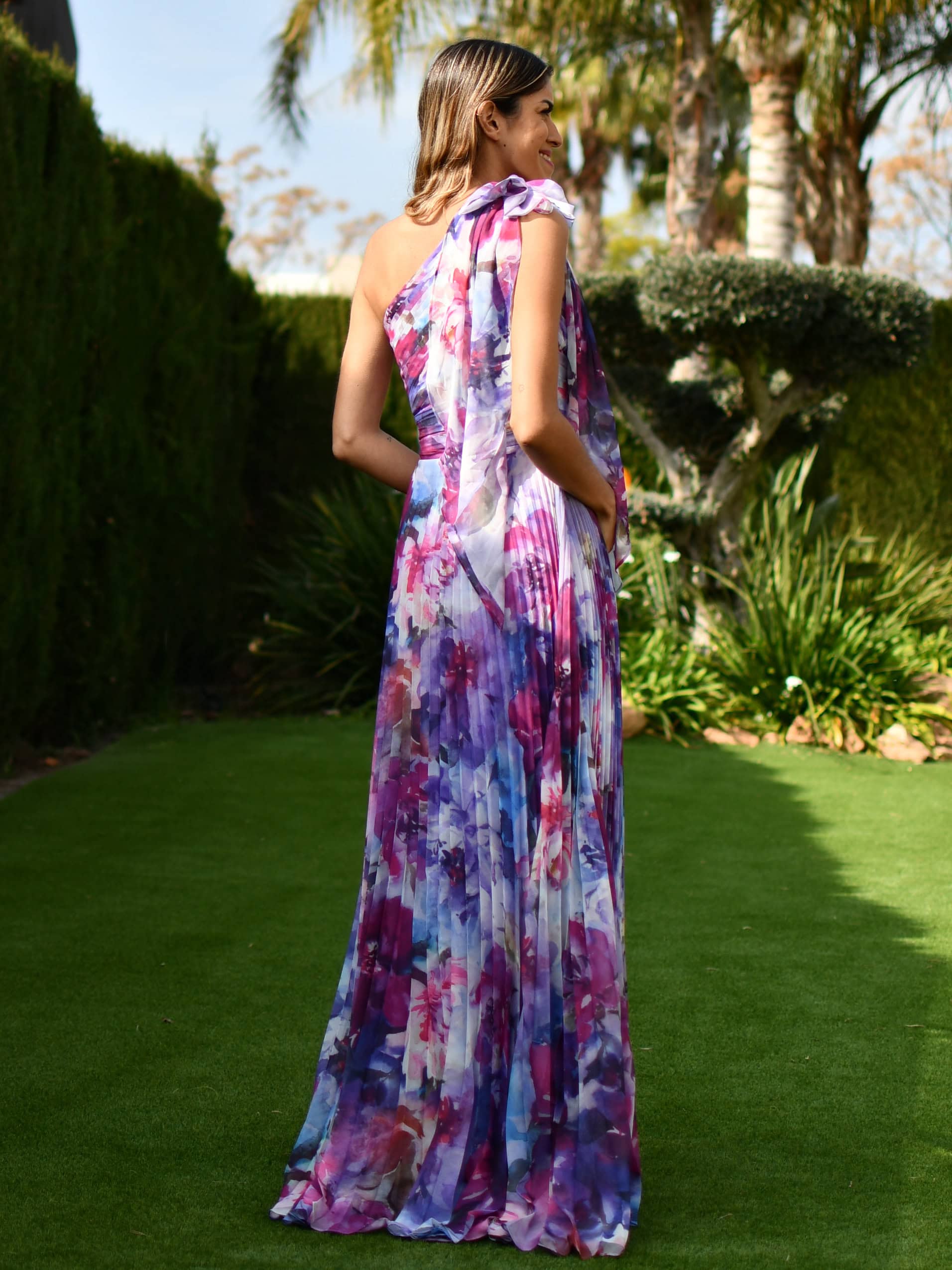 Vestido fiesta largo asimétrico estampado floral plisado con lazo ROMINA