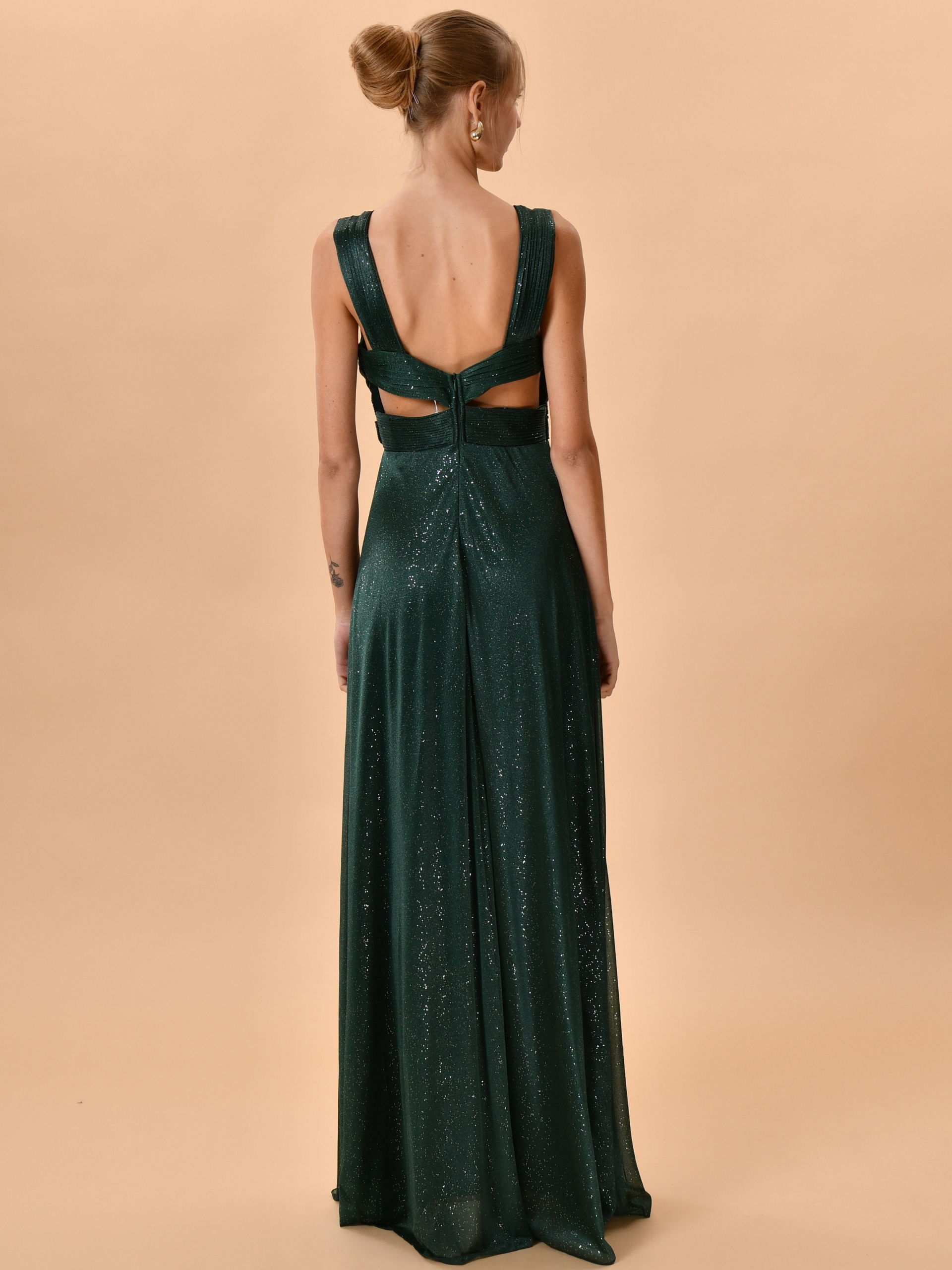 Confeccionado en un tejido con brillos, este modelo capta la luz de manera refinada, ofreciendo un efecto luminoso que resalta la figura sin excesos. Cada destello aporta un aire de distinción, ideal para eventos de gala, bodas, cenas elegantes o celebraciones especiales donde la presencia y el estilo son protagonistas.